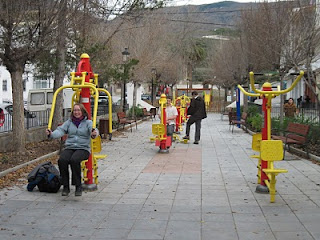 There are no excuses for not taking part in some kind of sport in Spain; the weather is good, there is the national obsession with football, there are cycle lanes, long beaches with joggers and if none of these appeal there are always the outdoor gyms. At first glance these look like children's playgrounds, every town has at least one installation of bright yellow and red metal gym equipment. We are unable to pass these gyms by without stopping and playing for a while, but it is never just us and the other campers who use these facilities, the Spanish are always there too; typically the users vary from the serious keep-fit person with an MP3 player and an earphone, to children, who find them more fun than the nearby play area.