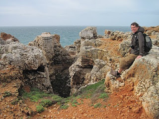 We came upon a group of four empty cars parked haphazardly by the cliffs and no sign of the occupants; Anthony speculated it was the scene of a drugs-war shoot out as we’d watched ‘No Country for Old Men’ the evening before. Carol pointed out that drug dealers rarely travel around in an old Renault Four. When we reached the cars we spotted their occupants half-way down the cliffs; they had climbed down with ropes and were participating in extreme fishing.
