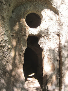 From the waterfall pool we took the steep path up to the cliffs, where an early Christian chapel, the Eremo di Poggio Conte, had been carved out of the tufa overlooking the waterfall; the effort that had gone in to this hidden gem was impressive, the chapel had leaves and columns carefully carved in to the ceiling, with patterns painted on the rock for decoration and an elegant carved doorway.
