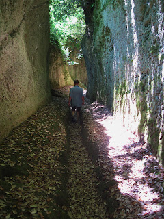 The Vie Cave, or excavated roads, are an impressive road network in the Sorano area, built to link Etruscan necropolis and settlements and later incorporated in to the Roman road system. The roads are deep trench-like routes excavated from the local tufa rock and Karin took us along the Via Cave San Rocco, a steep shady section of Vie Cave that took us down to the river Lente.