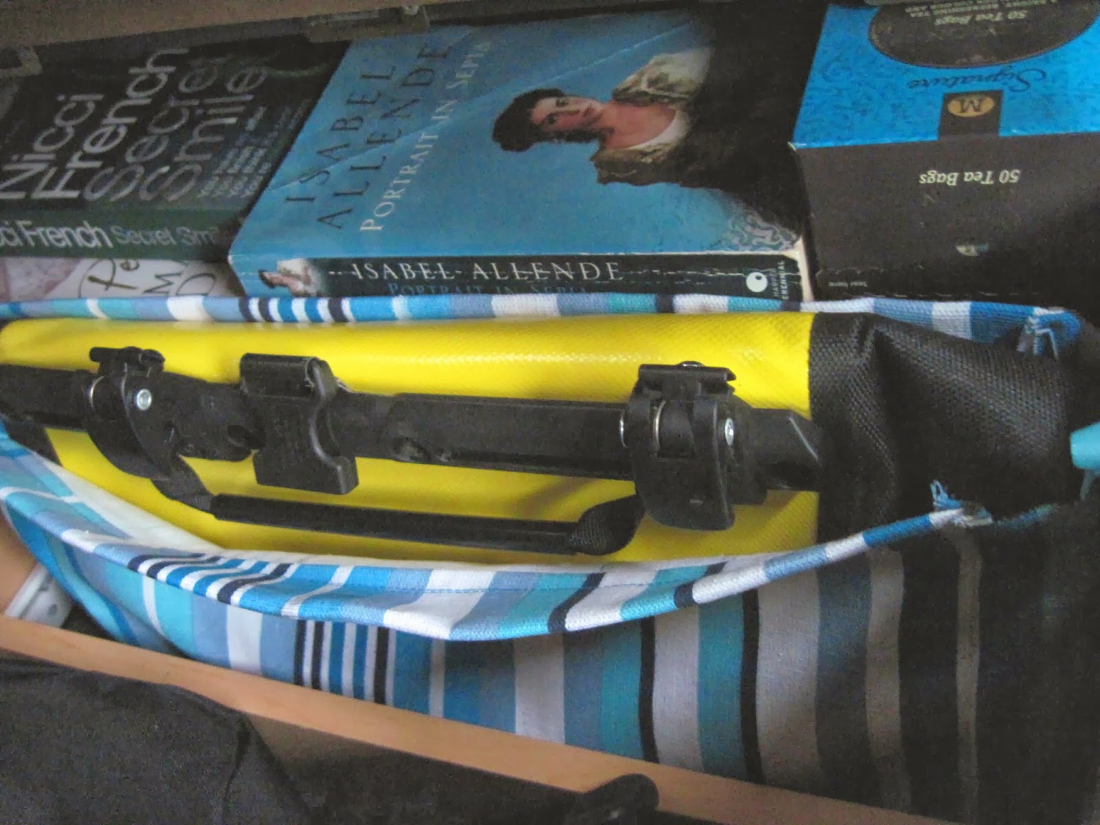 - Under the off-side passenger seat, books and more spare tea bags fit on top of the heater and a specially made bag hooks in the narrow gap between this and the back of the under seat drawer to fit a bicycle pannier.