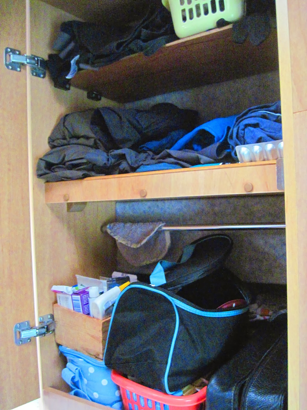 - Fishing tackle boxes for small items and tupperware boxes all labelled (because we are always forgetting what is in them) for one of the high cupboards